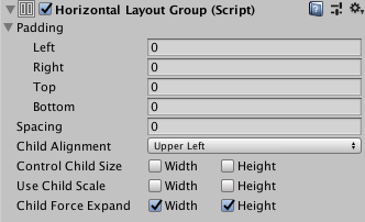|**Child Force Expand** |Whether to force the child layout elements to expand to fill additional available space. |