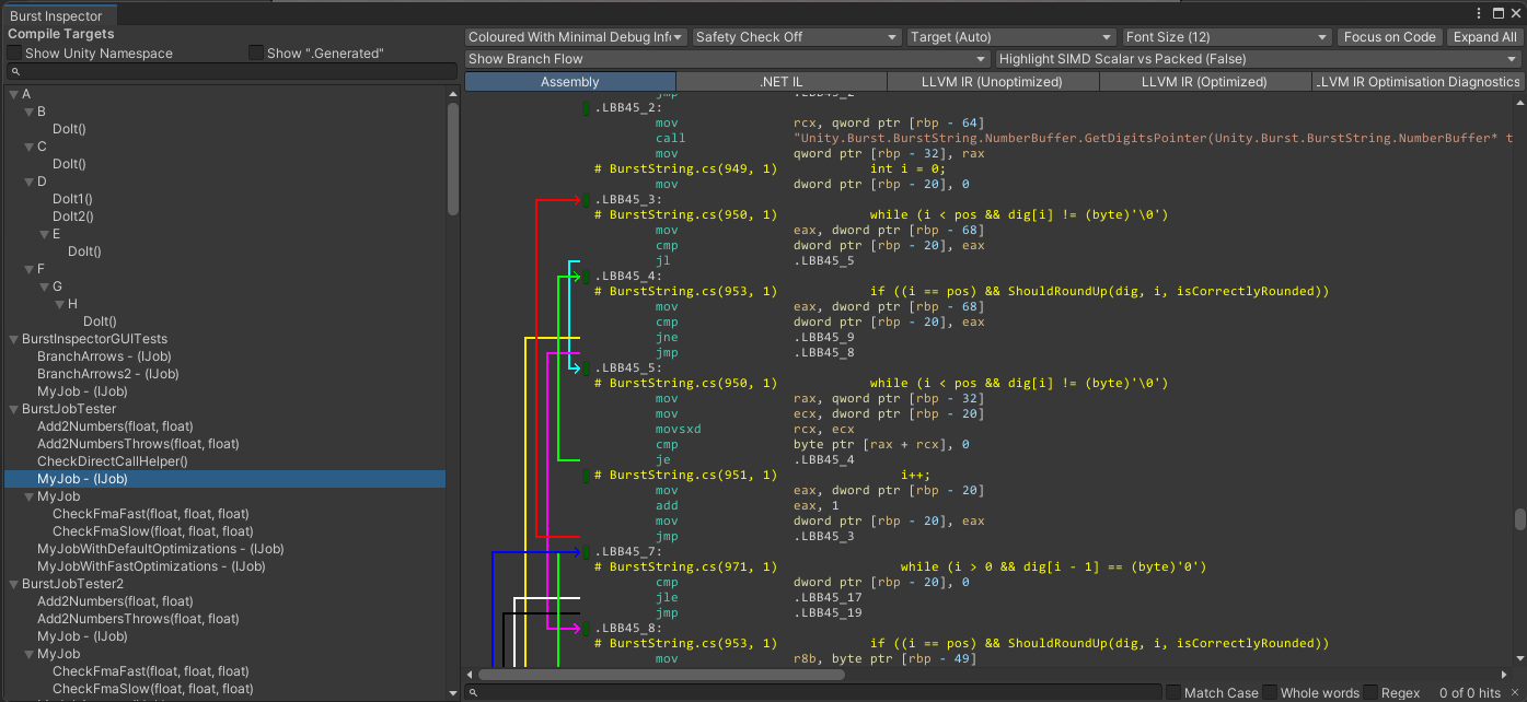The Burst Inspector displays all the jobs Burst can compile. It also displays the generated intermediate and native assembly code.