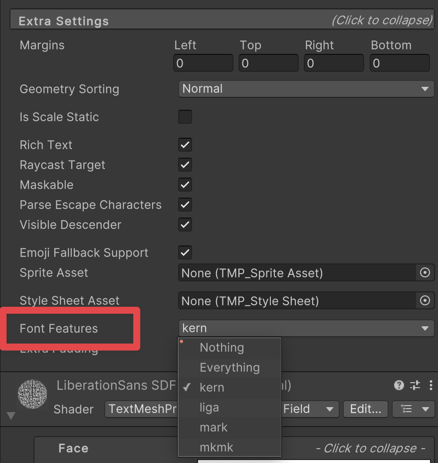 You can enable or disable the Font Features through the Font Features field in the Text component's Extra Settings section shown in the image below: