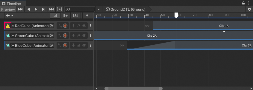 For example, if an Animation track is bound to a disabled GameObject, the icon switches to an alert icon.