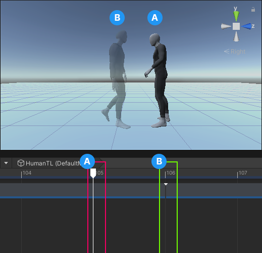 DefaultMaleat the start of theWalkAnimation clip, which starts at frame 106 (B), matches the position and rotation of theDefaultMaleat the end of theTurnLeftAnimation clip, which ends at frame 105 (A) -