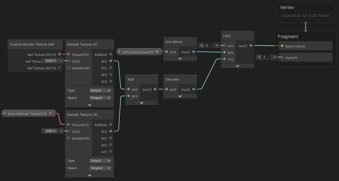 This example demonstrates how to set up a Shader Graph for Custom Render Texture shaders to create a self-healing deformation effect that could be used for snow, sand, etc.