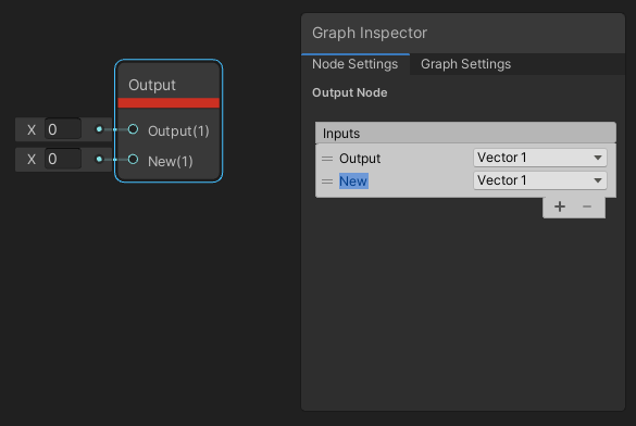 The Custom Port Menu is displayed in the Node Settings tab of the Graph Inspector by clicking on the Custom Function Node and Sub Graph output node. This menu allows you to add, remove, rename, reorder, and define the types of your custom input and output ports.