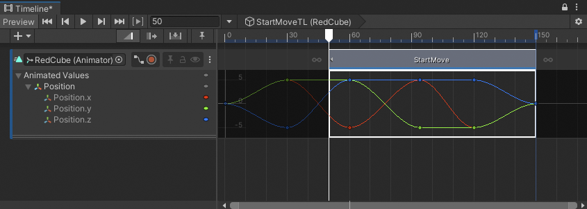 _The `EndRotation` clip loops once, indicated by L1. Its animation curve loops and is drawn in white._