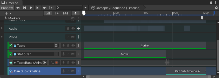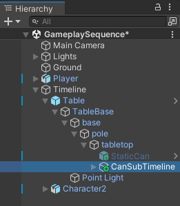 # Create a Sub-Timeline instance This workflow demonstrates how to create a single cut-scene by nesting a Timeline instance within another Timeline instance. This workflow uses the [Gameplay Sequence sample](samp-gameplay-demo.md). Consult [Timeline Samples](samp-overview.md) for information on the samples available from the Timeline package and how to import these samples into your projects. To demonstrate how to combine two Timeline instances, this workflow is divided into the following main tasks: 1. [Set up the main Timeline instance](#setupinstance). 1. [Add a Control track and create a Sub-Timeline instance](#subtimeline). 1. [Adjust the Control clip](#adjclip). 1. [Play the result](#playresult). ## Set up the main Timeline instance This workflow demonstrates how to combine two Timeline instances to create a single cut-scene. By default, in the Gameplay Sequence Demo scene, the `CanSubTimeline` Sub-Timeline instance is already combined with the `GameplaySequence` Timeline instance. Before demonstrating how to combine two Timeline instances, remove the Sub-Timeline instance. To do this, follow these steps: 1. Load the `GameplaySequence` scene and open the `GameplaySequence` Timeline instance in the Timeline window. Consult [Gameplay Sequence Demo](samp-gameplay-demo.md) for the steps on how to load the `GameplaySequence` scene and display the `GameplaySequence` Timeline instance. 1. In the Timeline window, expand the Props Track group. The Props Track group contains tracks that activate and animate the `Table` and `Can` GameObjects. The Props Track group also contains the `Can Sub-Timeline` Control track that nests the `CanSubTimeline` Timeline instance. This Timeline instance animates the `Can` GameObject as it bounces and falls off the table. ![](images/tl-props-expanded.png) _The Props Track group expanded in the Timeline window with the Can Sub-Timeline track selected_ Since this workflow demonstrates how to combine two Timeline instances, you should remove the nested `CanSubTimeline` Timeline instance. 1. To remove the nested `CanSubTimeline` Timeline instance, delete the `Can Sub-Timeline` Control track. To delete the `Can Sub-Timeline` Control track, select the More (⋮) menu from its Track Header and choose **Delete**. This is one way to delete a track from a Timeline instance. The Timeline window includes other ways [to delete a track](trk-delete.md). ## Add a Control track and create a Sub-Timeline instance To nest the `CanSubTimeline` Timeline instance within the `GameplaySequence` Timeline instance, do the following: 1. In the scene, select the GameObject associated with the Timeline instance that will be the main Timeline instance. In this workflow, the `GameplaySequence` is the main Timeline instance. It is associated with the `Timeline` GameObject. ![](images/hier-timeline-go.png) _Select the `Timeline` GameObject to display the `GameplaySequence` Timeline instance in the Timeline window_ 1. When the Timeline window displays the `GameplaySequence` Timeline instance, enable the Lock icon. When locked, the Timeline window does not change when you select GameObjects. This makes it easier to set up or modify a Timeline instance. 1. Add a Control track to the Props Track group. To do this, click the **Add** (**+**) button beside the Prop Track group name, and choose **Control Track**. ![](images/tl-props-add-menu.png) _The Add button (A) beside the Prop Track group name._ A new Control Track is added at the end of the Prop Track. You may have to scroll the Timeline window to view the new Control track. A Control track is a special track for adding a Particle System, a Prefab instance, a ITimeControl Script, or a nested Timeline instance. 1. In the Scene Hierarchy, find the GameObject that is associated with the Timeline instance to be nested. In this workflow, you want to nest the `CanSubTimeline` Timeline instance which is associated with the `CanSubTimeline` GameObject. This GameObject is within the `Table` hierarchy. ![](images/hier-cansubtimeline-go.png) _The CanSubTimeline is associated with CanSubTimeline GameObject_ 1. Select and drag the `CanSubTimeline` GameObject into the Control track that you added to the Props Track group. The Timeline window places a Control clip where you release the `CanSubTimeline` GameObject. The Control clip is set to the same size as the `CanSubTimeline` Timeline instance. When a Timeline instance is nested within another Timeline instance, the nested instance is referred to as a Sub-Timeline instance. ![](images/tl-props-control-clip.png) **(A)** Control track with a Control clip.