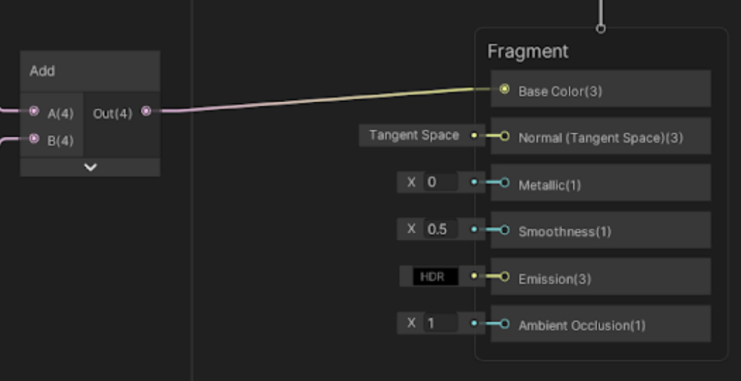 In this example, you connect to the Base Color block in order to pass the Vertex ID from the vertex shader to the fragment shader and use it as color output.
