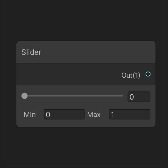 A slider control with an output labeled "out(1)". Below the slider, there is a range indicated by Min 0 on the left and Max 1 on the right. The current slider value is shown as 0, suggesting it is set at the minimum end of the range. A node labeled Time with multiple outputs, each named and connected as follows: Time(1), Sine Time(1), Cosine Time(1), Delta Time(1), Smooth Delta(1).