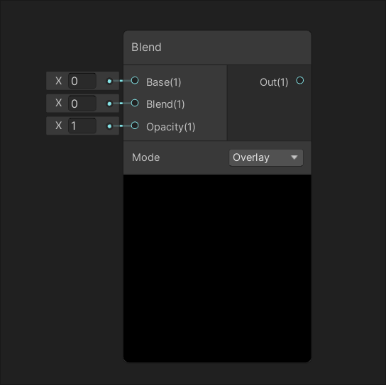 | Blends the value of input Blend onto input Base using the blending mode defined by parameter Mode. |