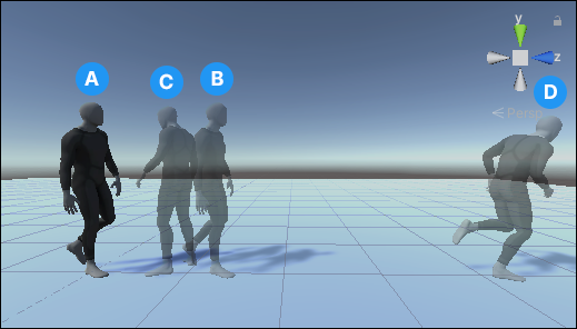 When first added, each Animation clip starts at the position and rotation of the character at the start of the Timeline instance. The following illustration shows the end of each Animation clip.