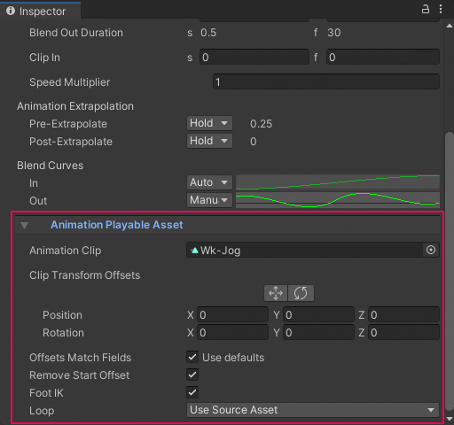 To view the Playable Asset properties for an Animation clip, expand Animation Playable Asset.
