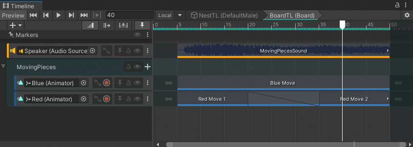 Drag a GameObject linked to a Timeline instance (BoardTL) into another Timeline instance (NestTL) to create a Sub-Timeline instance as a Control clip on a Control track