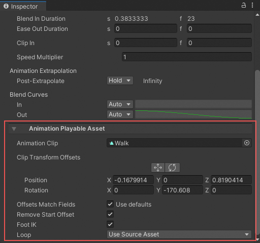 1. Select the Animation clip in the Timeline window and, in the Inspector window, expand Animation Playable Asset.