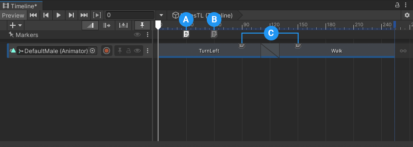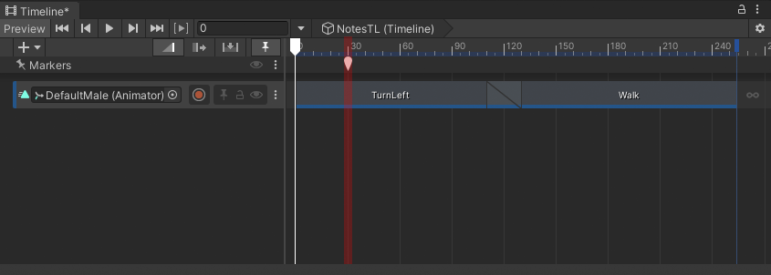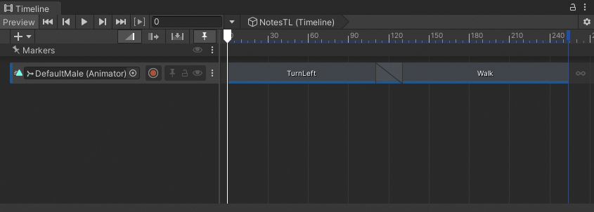 The examples in this workflow use the Timeline instance named NotesTL which has a single Animation track bound to the DefaultMale model. The content of this Animation track is the result of following the Animate a humanoid workflow.