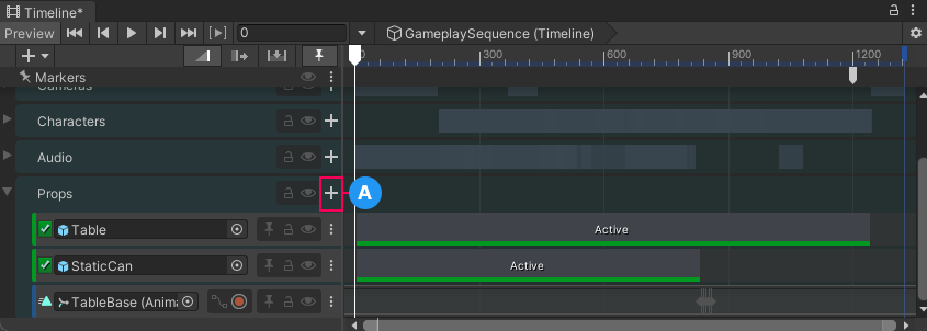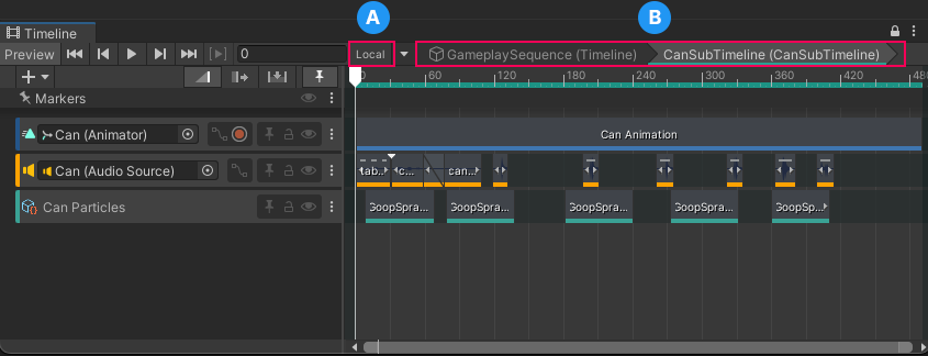 TableandCanGameObjects. The Props Track group also contains theCan Sub-TimelineControl track that nests theCanSubTimelineTimeline instance. This Timeline instance animates theCanGameObject as it bounces and falls off the table.