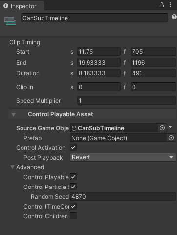 The properties for the CanSubTimeline Control clip display in the Inspector window